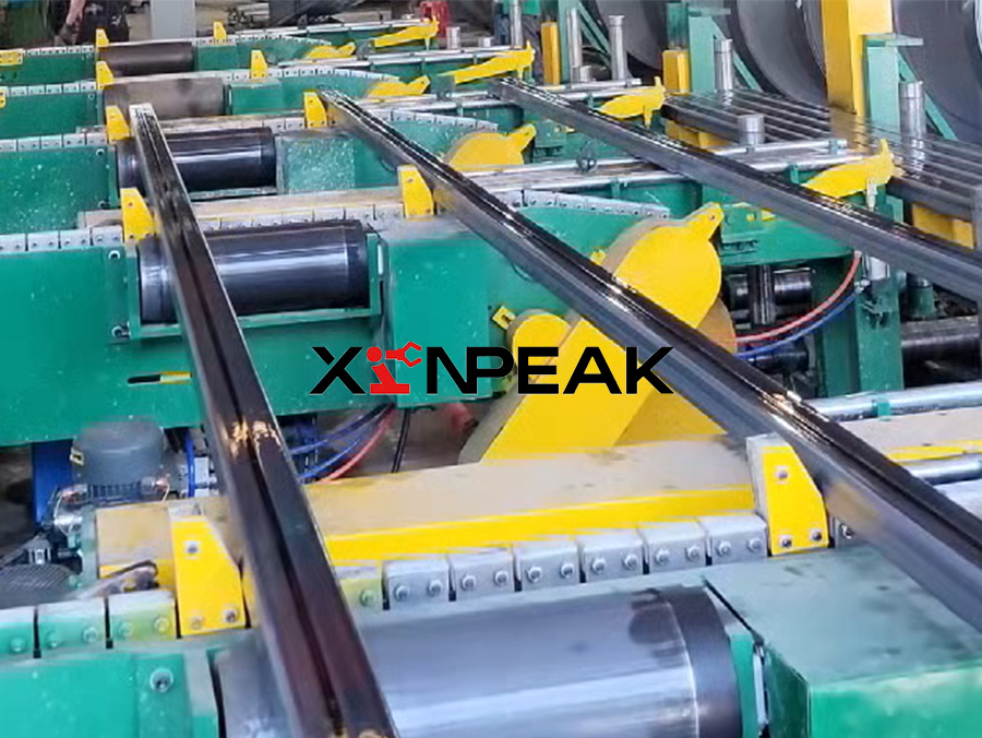 The square tube palletizer is an automated equipment system that integrates automatic collection, sorting, transportation, and palletizing functions. Its working principle follows an efficient and continuous process. Firstly, the square tube cut to length by the flying saw is horizontally transported to the predetermined position by the conveyor belt, and the front end collision plate serves as a mechanical limit to accurately stop the steel pipe. Subsequently, the picking rack lifts the stopped steel pipes from the conveyor belt and transfers them to the starting work platform of the palletizer. After the steel pipes enter the stacking area, the baffle device driven by the chain starts to work, cyclically pushing a single steel pipe forward and arranging it in sequence on the platform. When the accumulation of steel pipes reaches the preset number of single layers, the key fork arm device is activated, inserted under the steel pipe, and the entire layer of steel pipes is steadily lifted. Then, the fork arm carries the layer of steel pipes horizontally to the stacking area, and stacks them in layers according to the predetermined program to complete one layer of stacking. After completing each stack, the equipment will activate the leveling device to push the end face of the entire stack of steel pipes flat from the side, ensuring that the stack shape is neat and the edges are aligned. The whole package of steel pipes formed by palletizing is finally received and transported out by the whole package conveyor belt, and then transferred to the subsequent bundling and lifting area to prepare for storage or shipment.